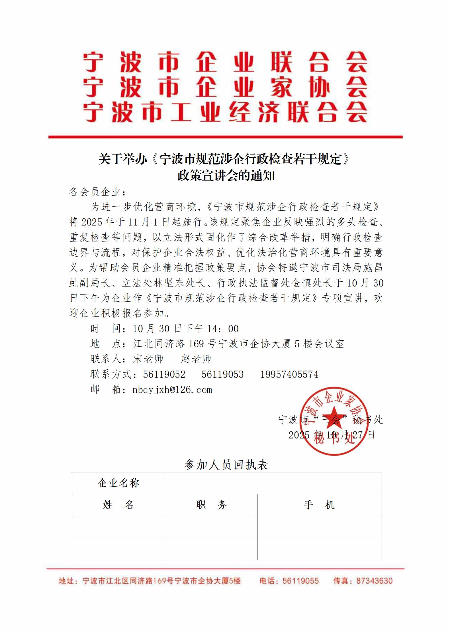 关于举办《宁波市规范涉企行政检查若干规定》 政策宣讲会的通知